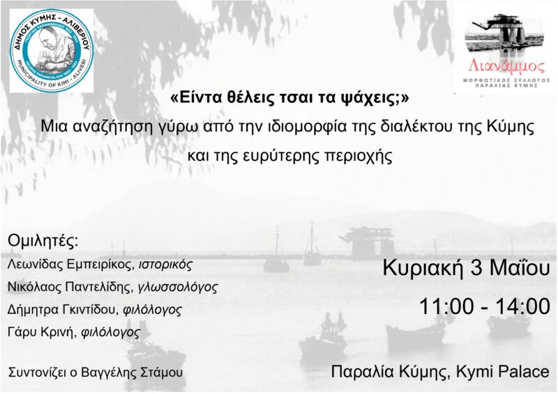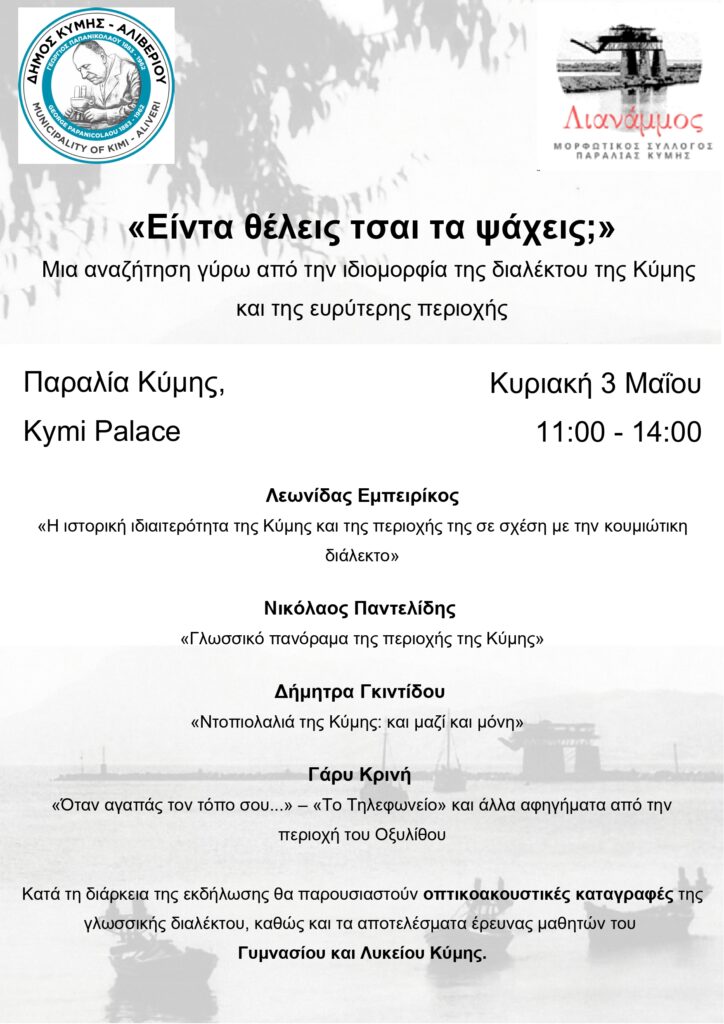Ο Σύλλογος Παραλίας Κύμης «Λιανάμμος» με τη στήριξη του Δήμου Κύμης-Αλιβερίου, διοργανώνει εκδήλωση αφιερωμένη στη μελέτη, ανάδειξη και διατήρηση της διαλέκτου της Κύμης και της ευρύτερης περιοχής της, την Κυριακή 3 Μαΐου 2026, στην αίθουσα συνεδριάσεων του ξενοδοχείου Kymi Palace (Παραλία Κύμης).