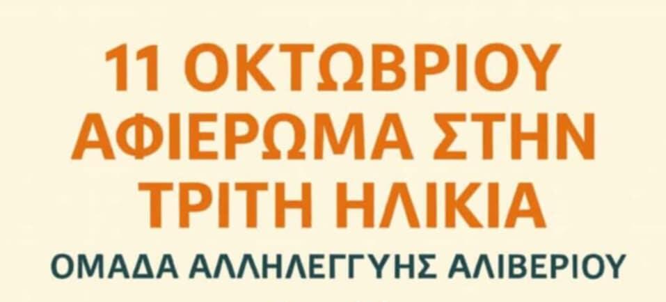 Η Ομάδα Αλληλεγγύης Αλιβερίου διοργανώνει εκδήλωση «Αφιέρωμα στην Τρίτη Ηλικία» με θέμα: «Μυστικά Αντιγήρανσης και Ευεξίας», με ομιλήτρια την Ειδική Παθολόγο – Γηρίατρο, Δρ. Βαρβάρα Δογιάμη.