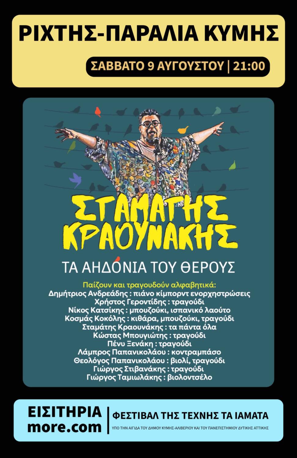 Το Φεστιβάλ της Τέχνης τα Ιάματα φέρνει στις 9 Αυγούστου με την πανσέληνο τον Σταμάτη Κραουνάκη και την ομαδάρα του. Τ’ Αηδόνια Του Θέρους. Στην Παραλία Κύμης, στον Ρίχτη!