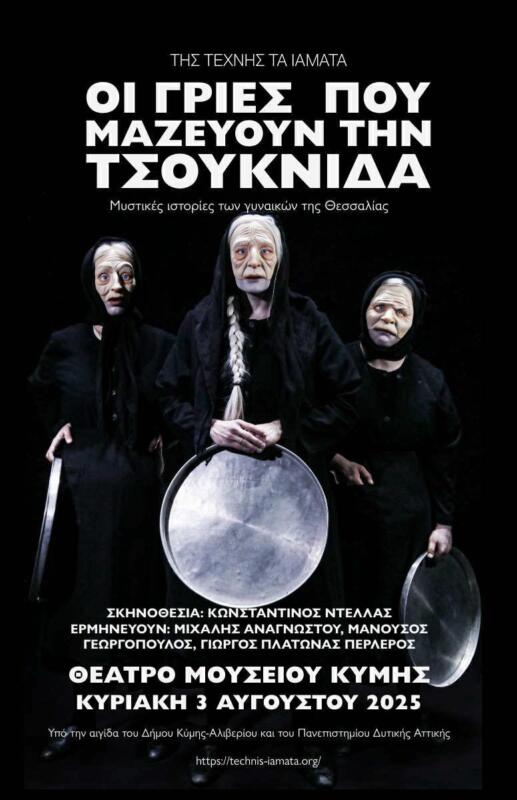 Αυτές οι «Γυναίκες της Γης» που έμεναν αόρατες χρόνια ακόμα και για τους ερευνητές – αφού δεν θεωρούσαν άξιο καταγραφής τον λόγο μιας γυναίκας για την ιστορία ενός τόπου- προσεγγίζονται σκηνικά από τρία αρσενικά νεαρά σώματα, επιχειρώντας να φέρουν στη σκηνή το προσωπικό και συλλογικό αφήγημα του οικείου γηρασμένου θηλυκού σώματος. Με εκφραστικά εργαλεία τις πρώτες ύλες της τελετουργικής διαδικασίας, τη μεταμφίεση, τη μάσκα και τον συντονισμό του λόγου και του σώματος, οι τρεις ηθοποιοί επιδίδονται σε ένα καταιγιστικό storytelling που ταξιδεύει από τις Μεταμορφώσεις του Οβίδιου και τα Φαρσάλια του Λουκανού μέχρι τη σύγχρονη ελληνική λογοτεχνία του Θωμά Ψύρρα, από παλιότερες αφηγήσεις, συνταγές και ιατροσοφικούς κώδικες του 19ου αιώνα, μέχρι σύγχρονες συνεντεύξεις που έγιναν κατά τη διάρκεια των παραστάσεων στη Θεσσαλία.